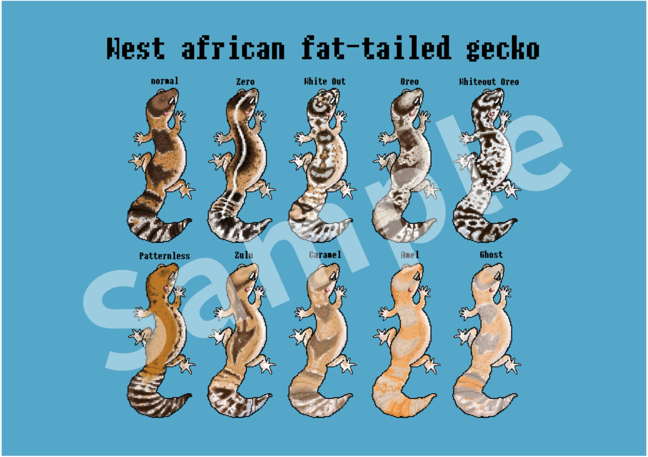 ドット絵のニシアフリカトカゲモドキの代表的なモルフ一覧のA2サイズポスターです(*´˘`*)